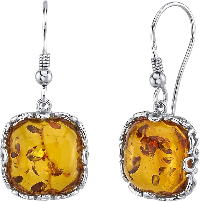 Peora Genuine Baltic Amber Cushion Cut Dangle Earrings in Sterling Silver, Rich Cognac Color, Designer Scroll Gallery, Fish Hooks